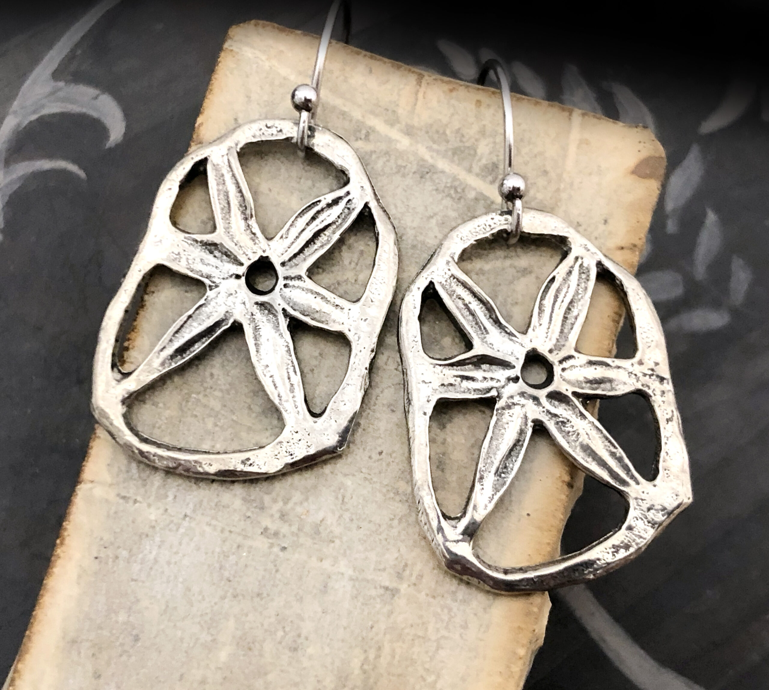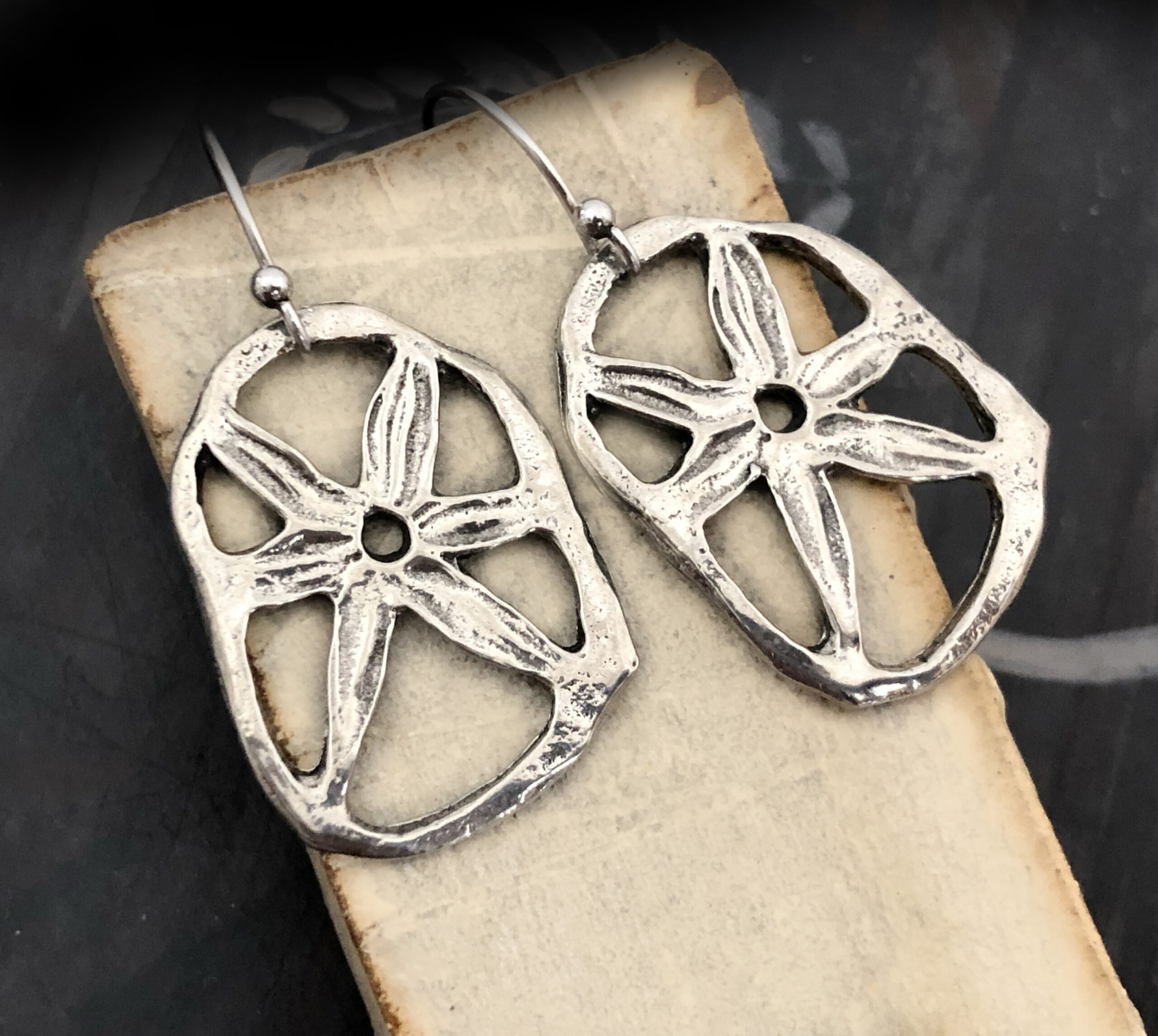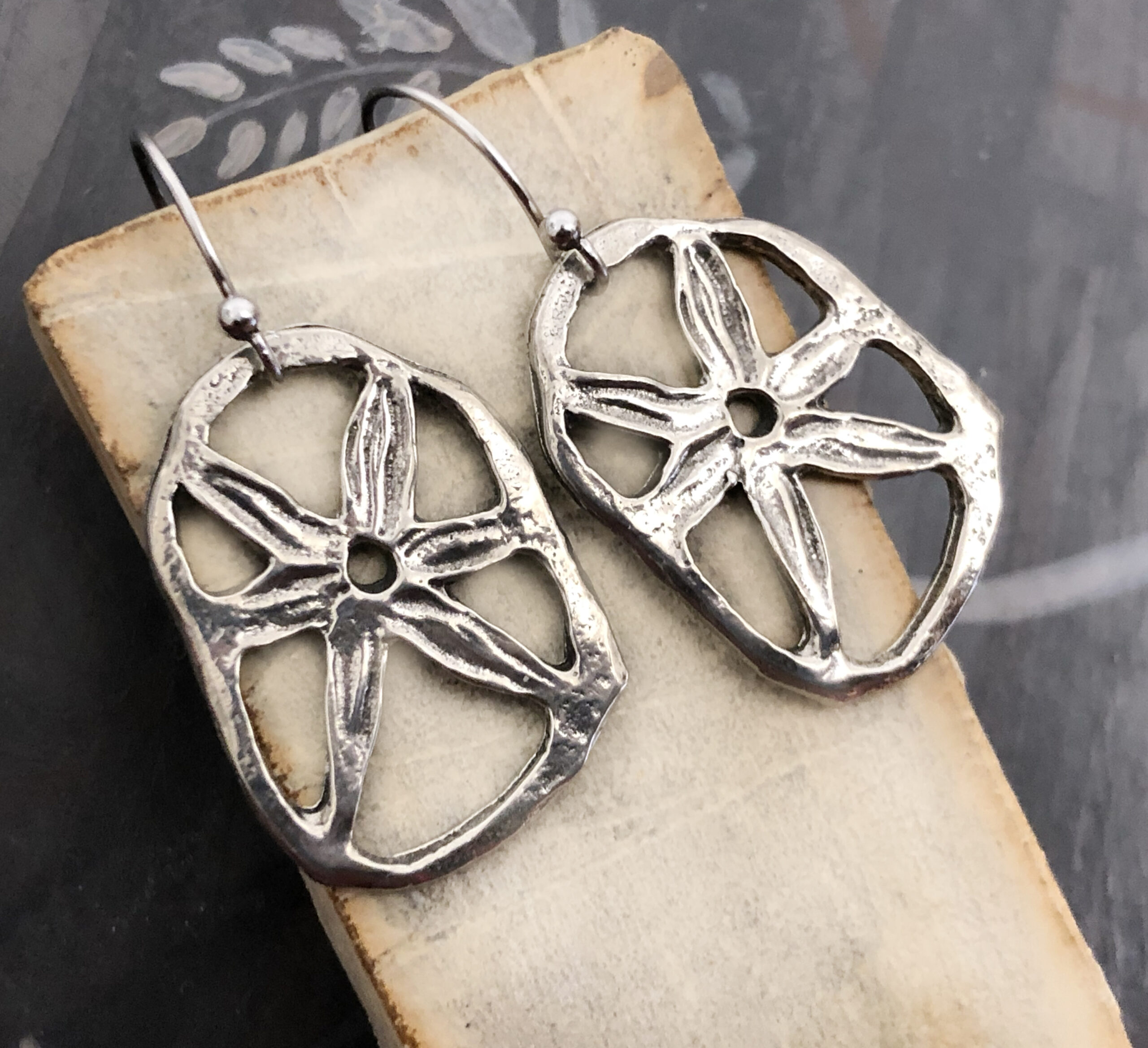 Earrings featuring original pewter charms made by us.